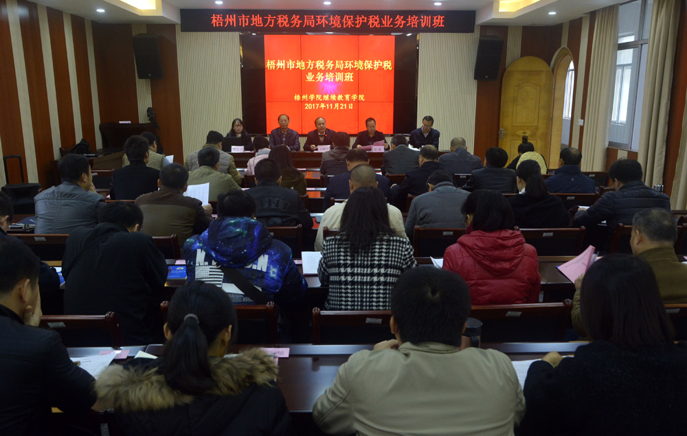 2017年11月21日上午,梧州市地方税务局环境保护税业务培训班在我校顺利开班。玉振明副校长、梧州市地方税务局局长洪效、副局长郑超延,以及继续教育学院领导出席开班典礼。开班典礼由继续教育院长毛廷贵主持。